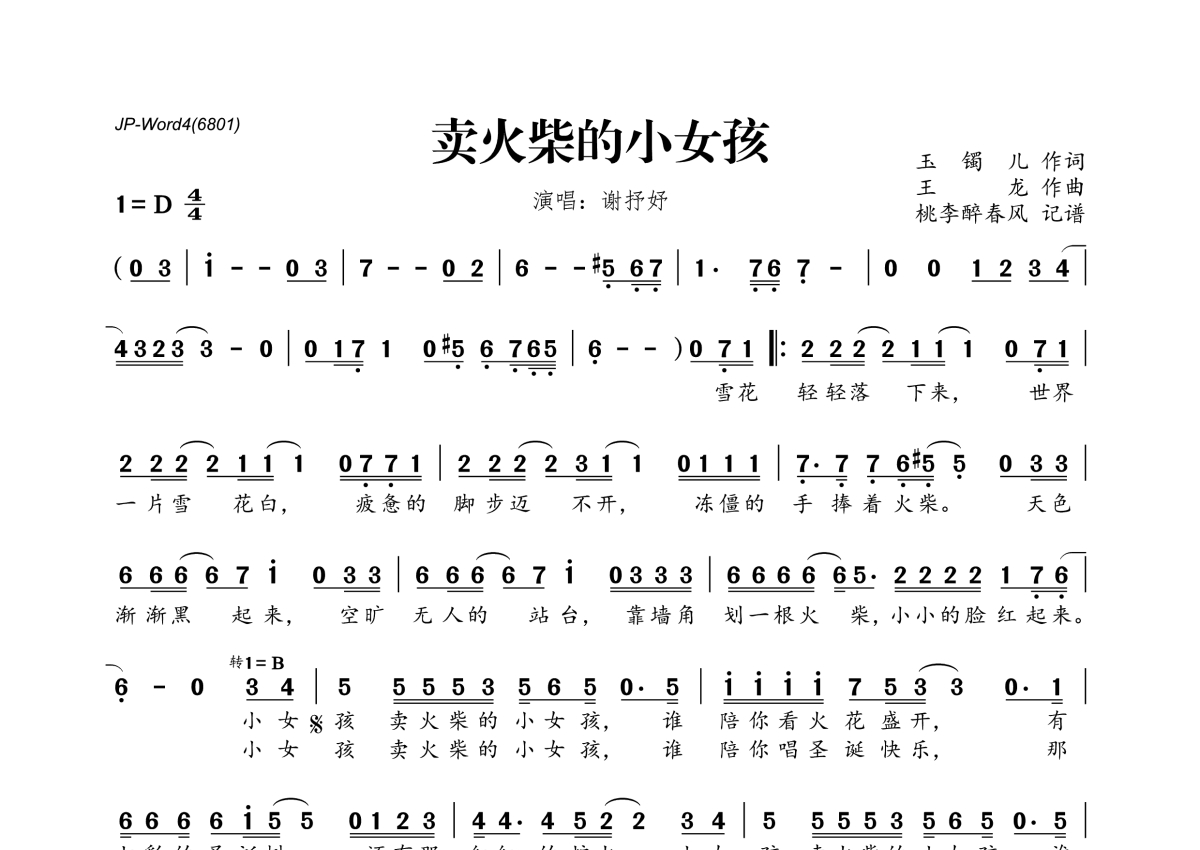卖火柴的小女孩简谱 - 谢抒妤演唱