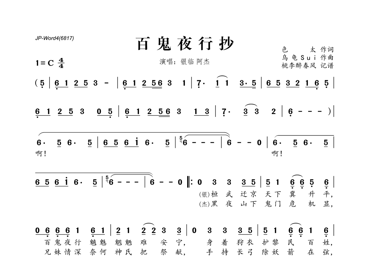 《百鬼夜行抄》是银临&阿杰演唱的一首歌曲,拍号为4/4拍,这份简谱共有两张高清图谱,图谱由 @桃李醉春风 编配上传。