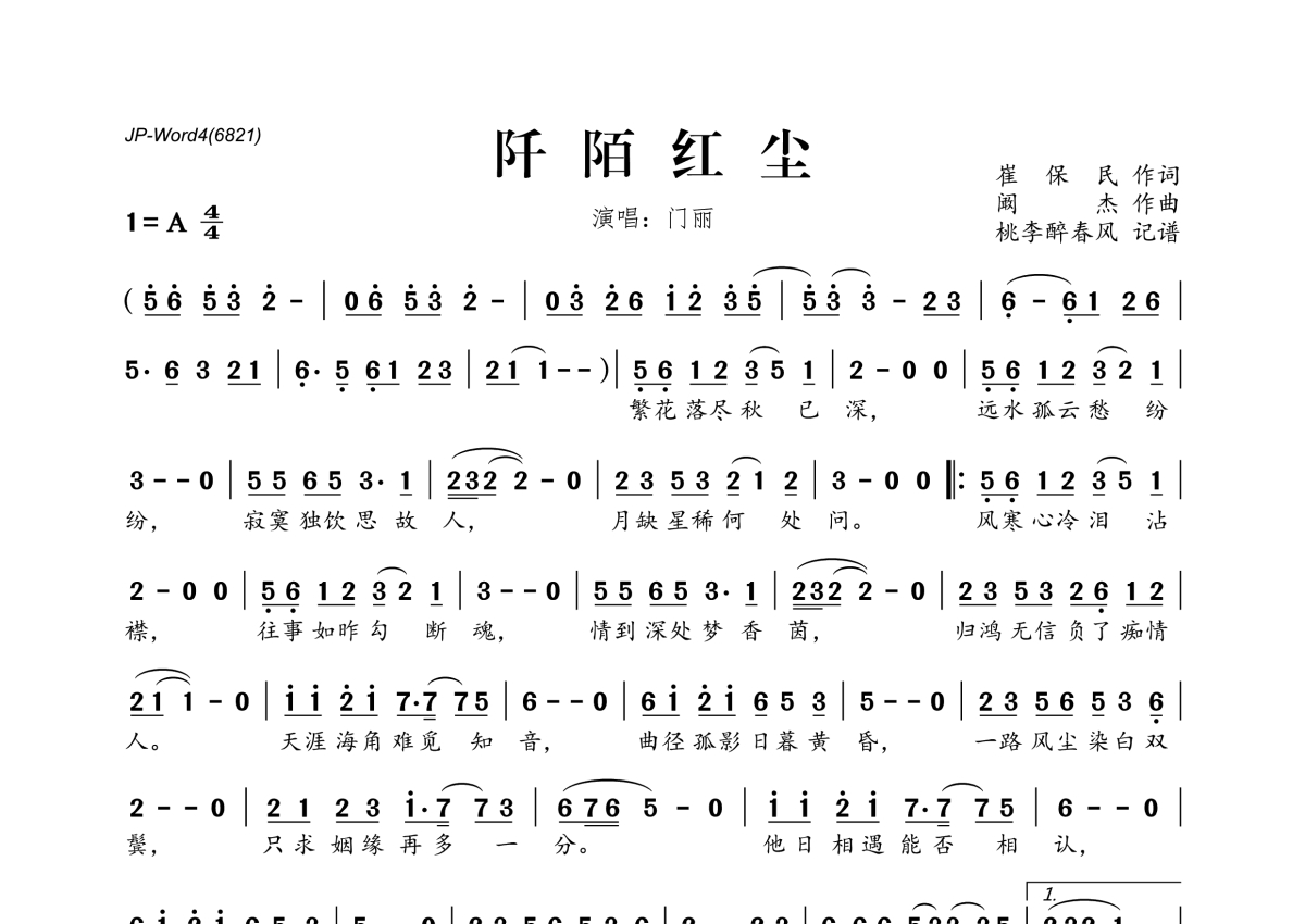 阡陌红尘简谱 - 门丽演唱