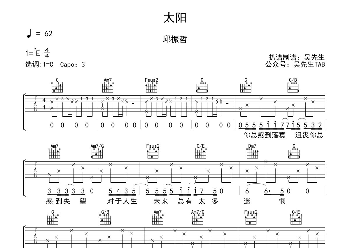 《太阳》是邱振哲演唱的一首歌曲,本吉他谱采用的是C调指法编配,这份吉他谱共有两张高清图谱,图谱由 @吴先生TAB 编配上传,图谱使用六线谱编配,包含吉他和弦指法、简谱以及歌词部分,使用这份太阳吉他谱,可以让你更加方便地掌握这首歌曲的弹唱技巧,快来尝试吧。邱振哲《太阳》吉他谱_C调吉他弹唱谱。