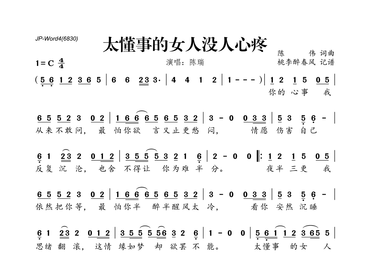 《太懂事的女人没人心疼》是陈瑞演唱的一首歌曲,拍号为4/4拍,这份简谱共有一张高清图谱,图谱由 @桃李醉春风 编配上传。