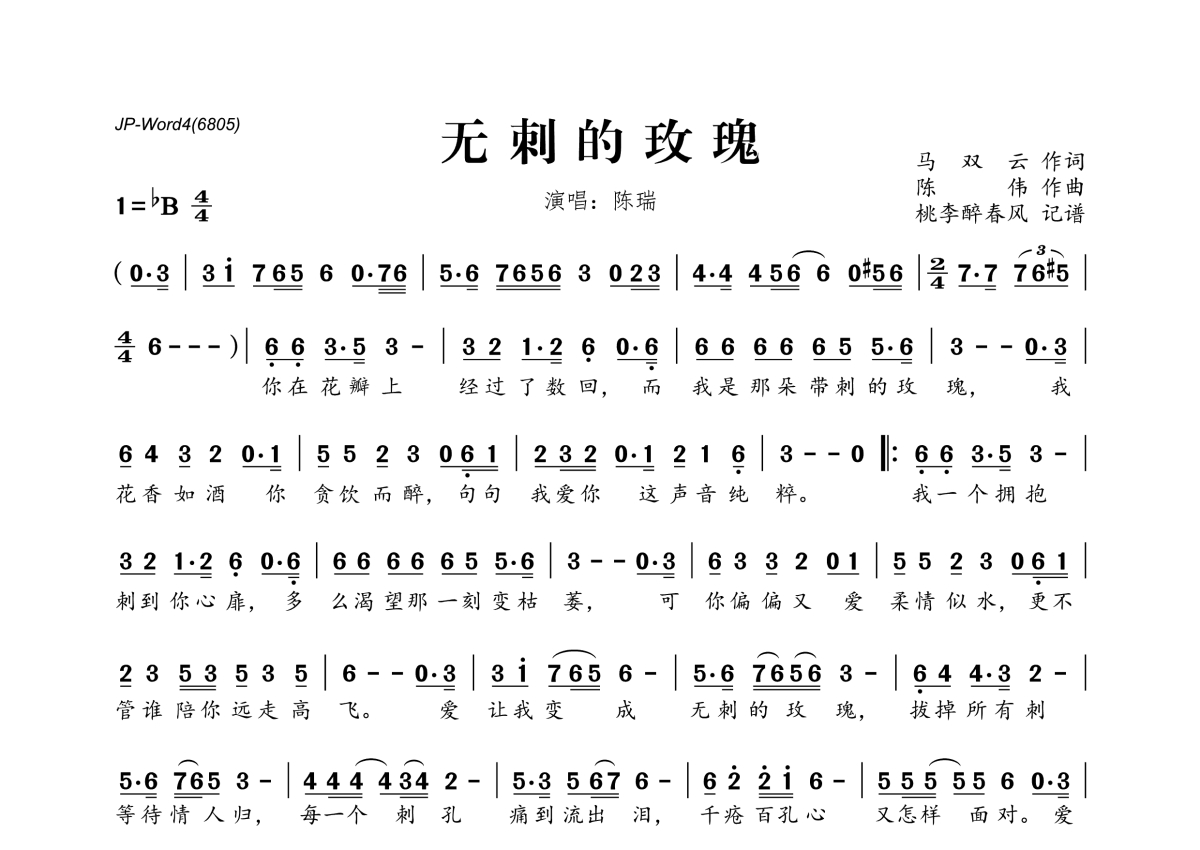 无刺的玫瑰简谱 - 陈瑞演唱