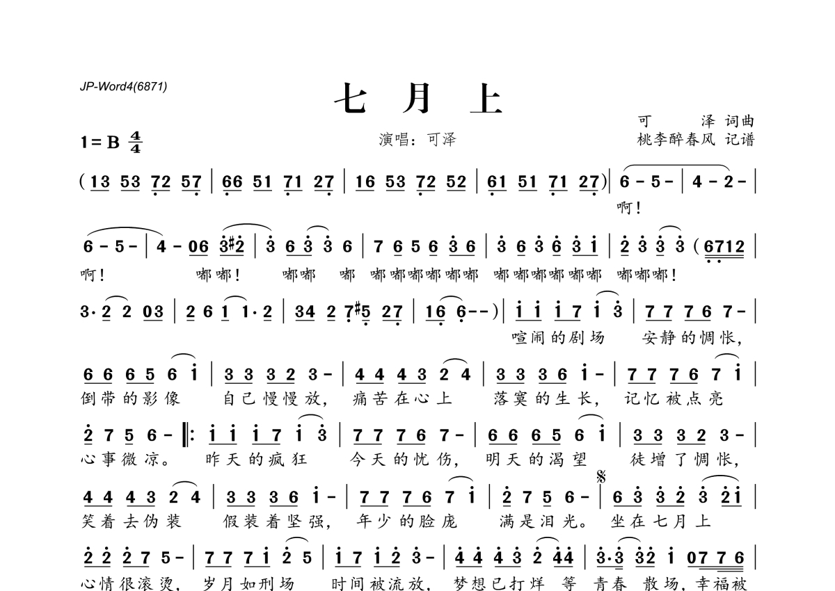 《七月上》是可泽演唱的一首歌曲,拍号为4/4拍,这份简谱共有一张高清图谱,图谱由 @桃李醉春风 编配上传。