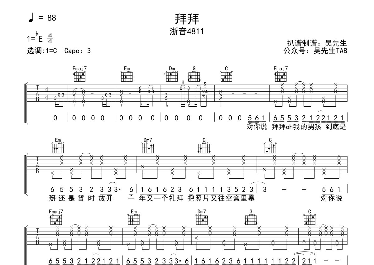 《拜拜》是浙音4811演唱的一首歌曲,本吉他谱采用的是C调指法编配,这份吉他谱共有两张高清图谱,图谱由 @吴先生TAB 编配上传,图谱使用六线谱编配,包含吉他和弦指法、简谱以及歌词部分,使用这份拜拜吉他谱,可以让你更加方便地掌握这首歌曲的弹唱技巧,快来尝试吧。原调降E调,变调夹3品。