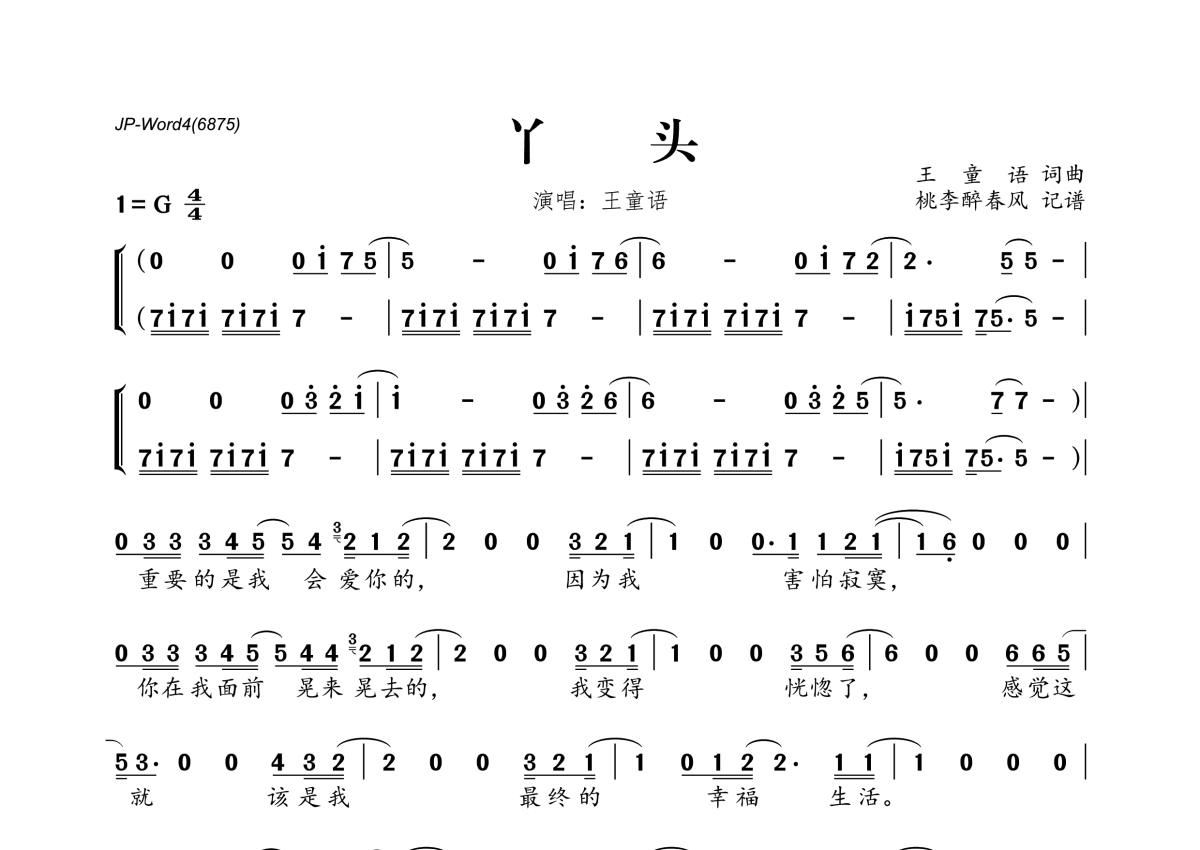 《丫头》是王童语演唱的一首歌曲,拍号为4/4拍,这份简谱共有两张高清图谱,图谱由 @桃李醉春风 编配上传。