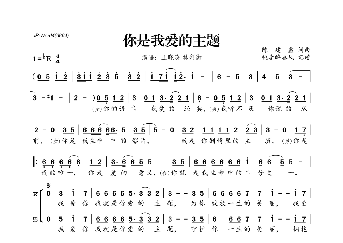 王晓晓&林剑衡《你是我爱的主题》简谱