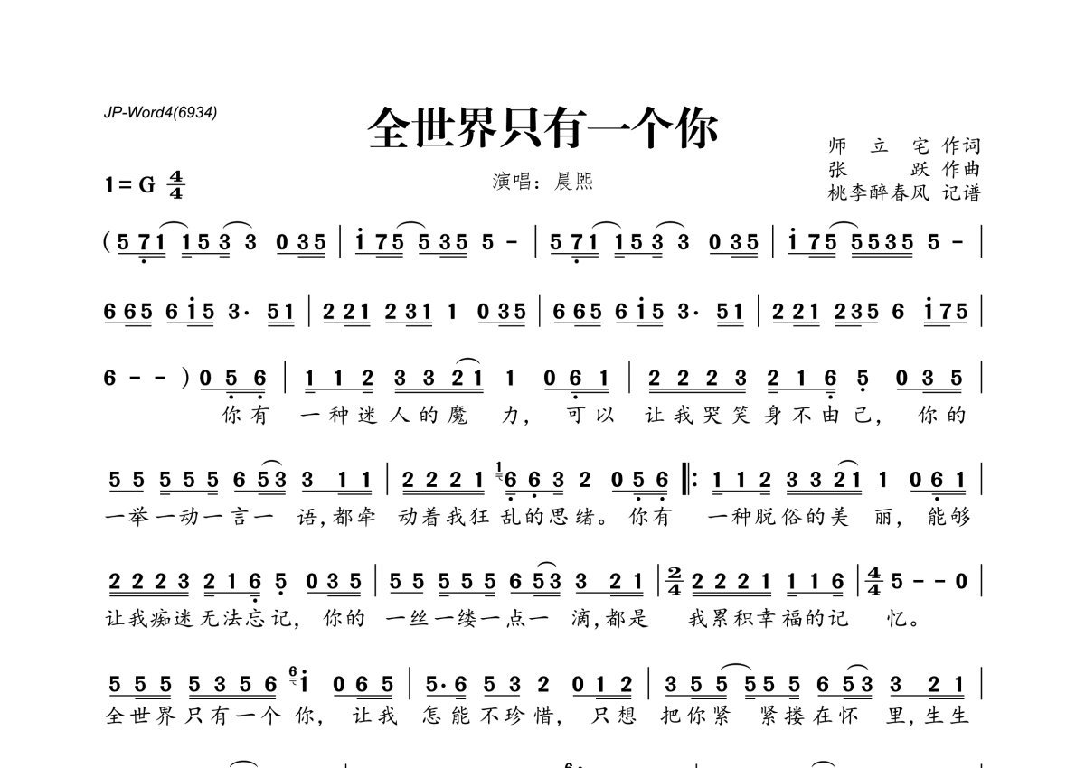 《全世界只有一个你》是晨熙演唱的一首歌曲,拍号为4/4拍,这份简谱共有一张高清图谱,图谱由 @桃李醉春风 编配上传。