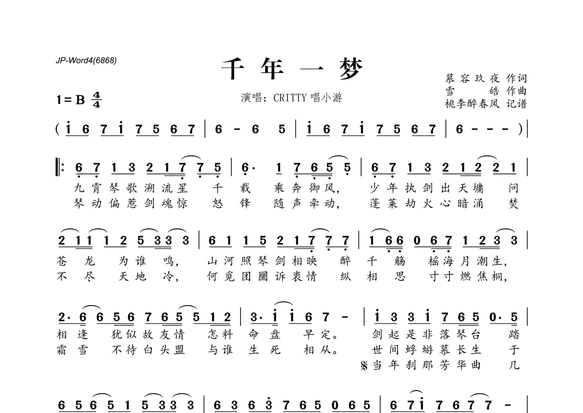 《千年一梦》是CRITTY&唱小游演唱的一首歌曲,拍号为4/4拍,这份简谱共有一张高清图谱,图谱由 @桃李醉春风 编配上传。