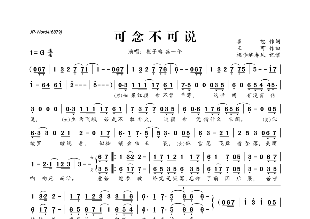 《可念不可说》是崔子格演唱的一首歌曲,拍号为4/4拍,这份简谱共有一张高清图谱,图谱由 @桃李醉春风 编配上传。