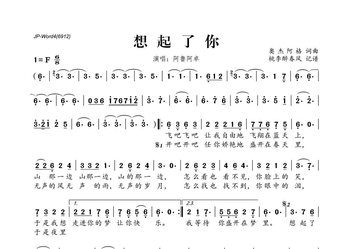 《想起了你》是阿鲁阿卓演唱的一首歌曲,拍号为6/8拍,这份简谱共有一张高清图谱,图谱由 @桃李醉春风 编配上传。