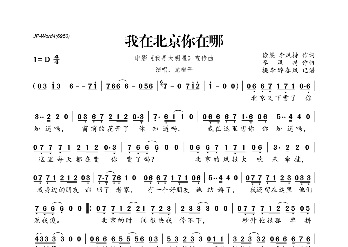 《我在北京你在哪》是龙梅子演唱的一首歌曲,拍号为4/4拍,这份简谱共有一张高清图谱,图谱由 @桃李醉春风 编配上传。