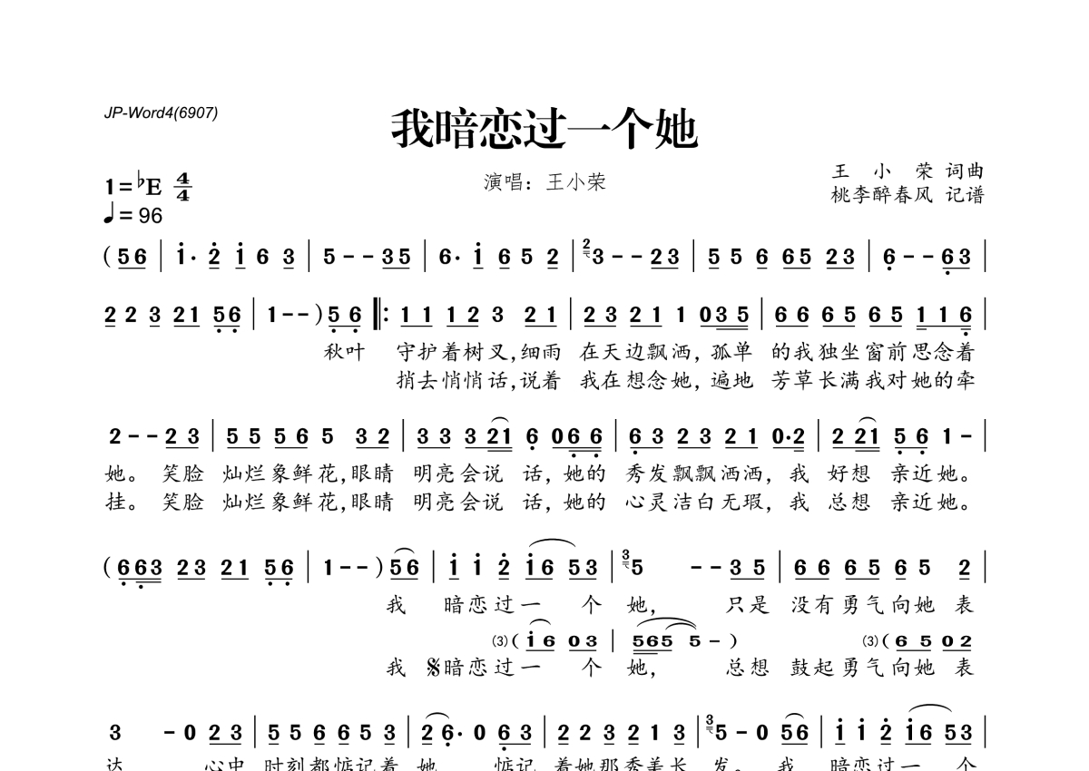 《我暗恋过一个她》是王小荣演唱的一首歌曲,拍号为4/4拍,这份简谱共有一张高清图谱,图谱由 @桃李醉春风 编配上传。