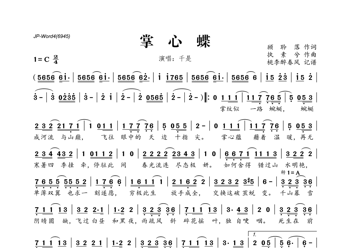 《掌心蝶》是千是演唱的一首歌曲,拍号为2/4拍,这份简谱共有一张高清图谱,图谱由 @桃李醉春风 编配上传。