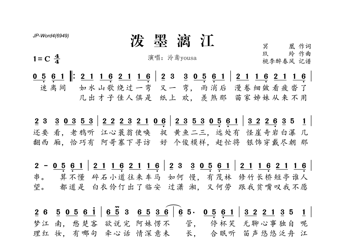 《泼墨漓江》是泠鸢yousa演唱的一首歌曲,拍号为4/4拍,这份简谱共有两张高清图谱,图谱由 @桃李醉春风 编配上传。
