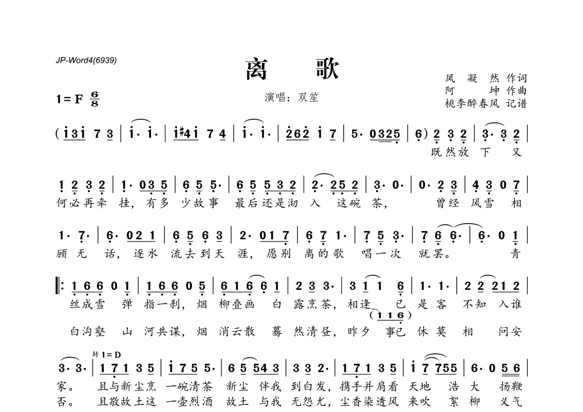 《离歌》是双笙演唱的一首歌曲,拍号为6/8拍,这份简谱共有一张高清图谱,图谱由 @桃李醉春风 编配上传。