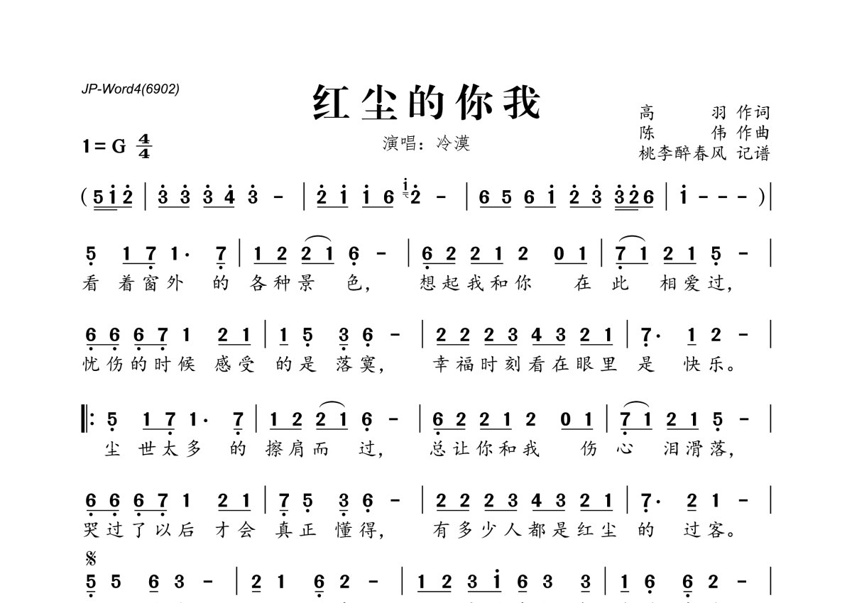《红尘的你我》是冷漠演唱的一首歌曲,拍号为4/4拍,这份简谱共有一张高清图谱,图谱由 @桃李醉春风 编配上传。