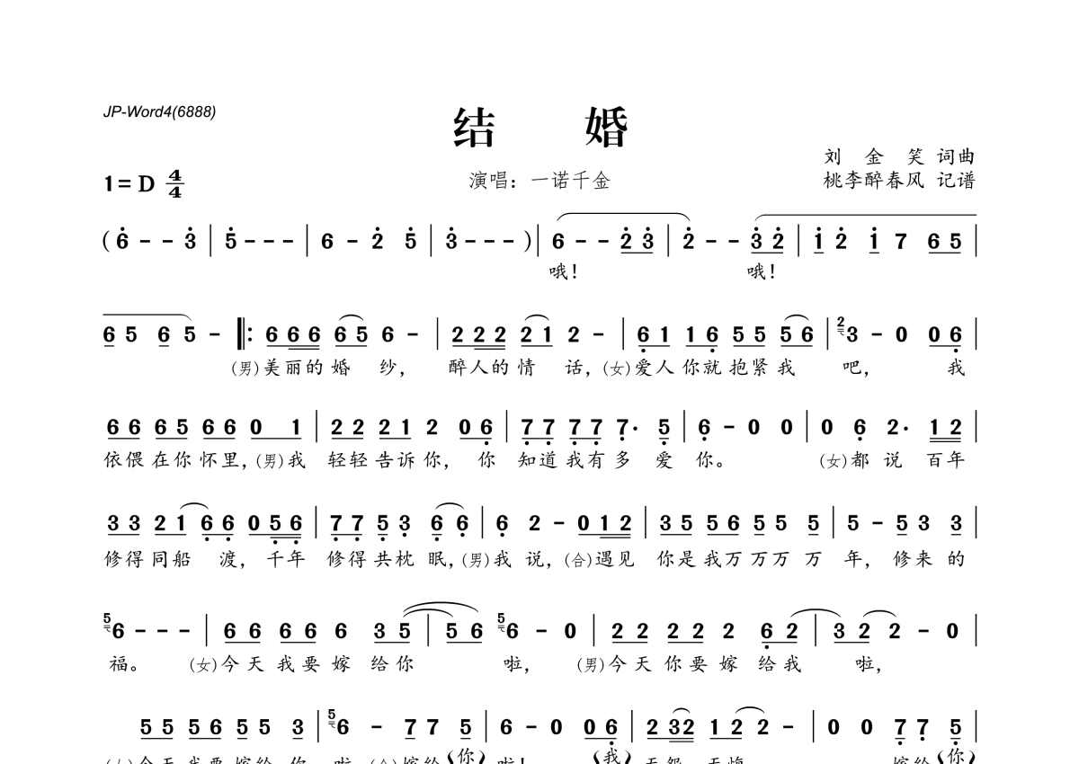 《结婚》是一诺千金演唱的一首歌曲,拍号为4/4拍,这份简谱共有一张高清图谱,图谱由 @桃李醉春风 编配上传。