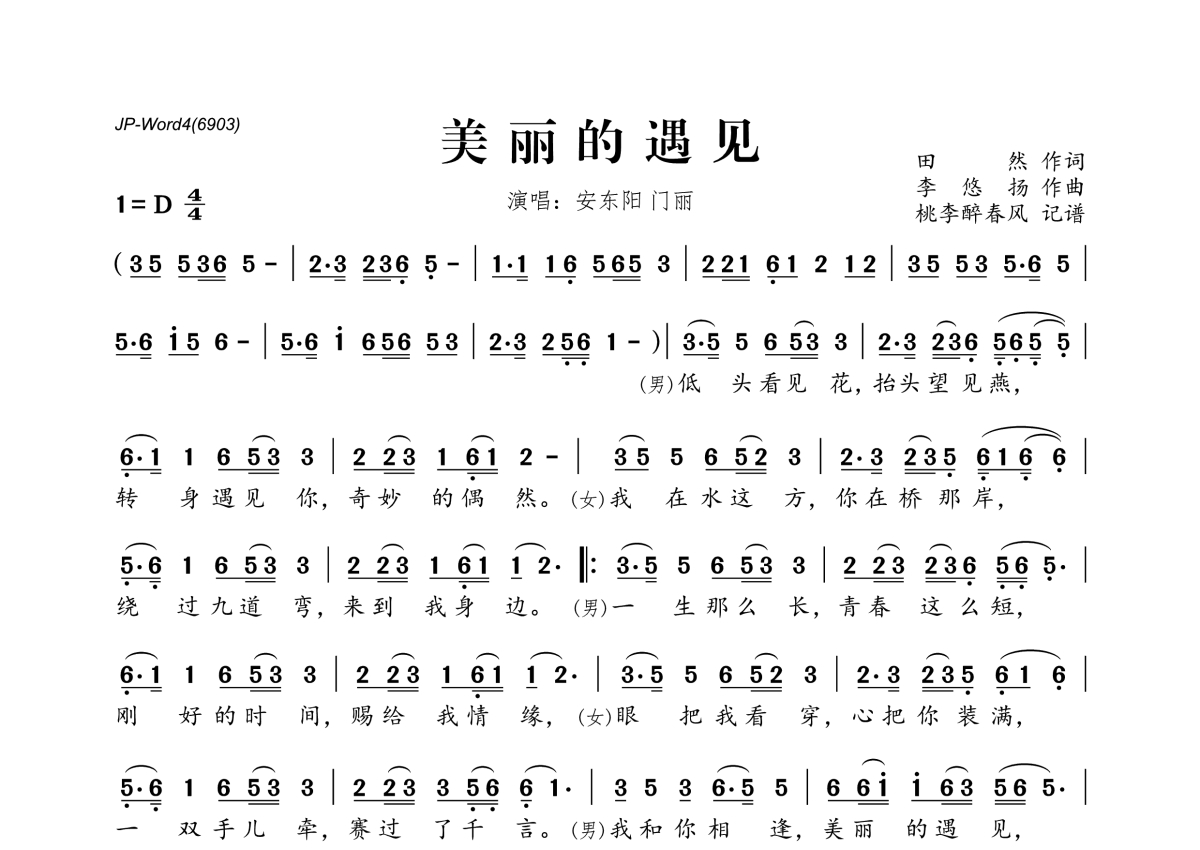 美丽的遇见简谱 - 安东阳&门丽演唱