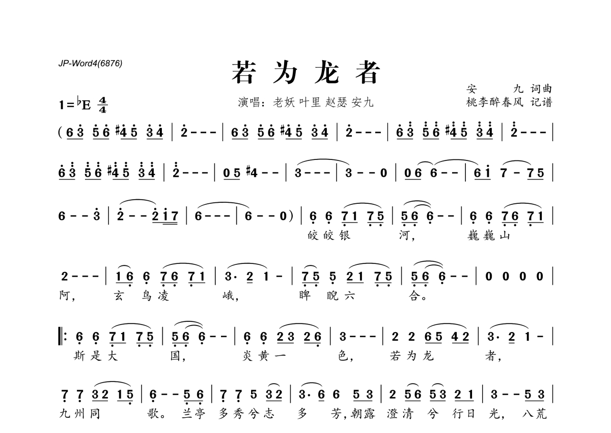 《若为龙者》是老妖&叶里&安九&赵瑟演唱的一首歌曲,拍号为4/4拍,这份简谱共有一张高清图谱,图谱由 @桃李醉春风 编配上传。