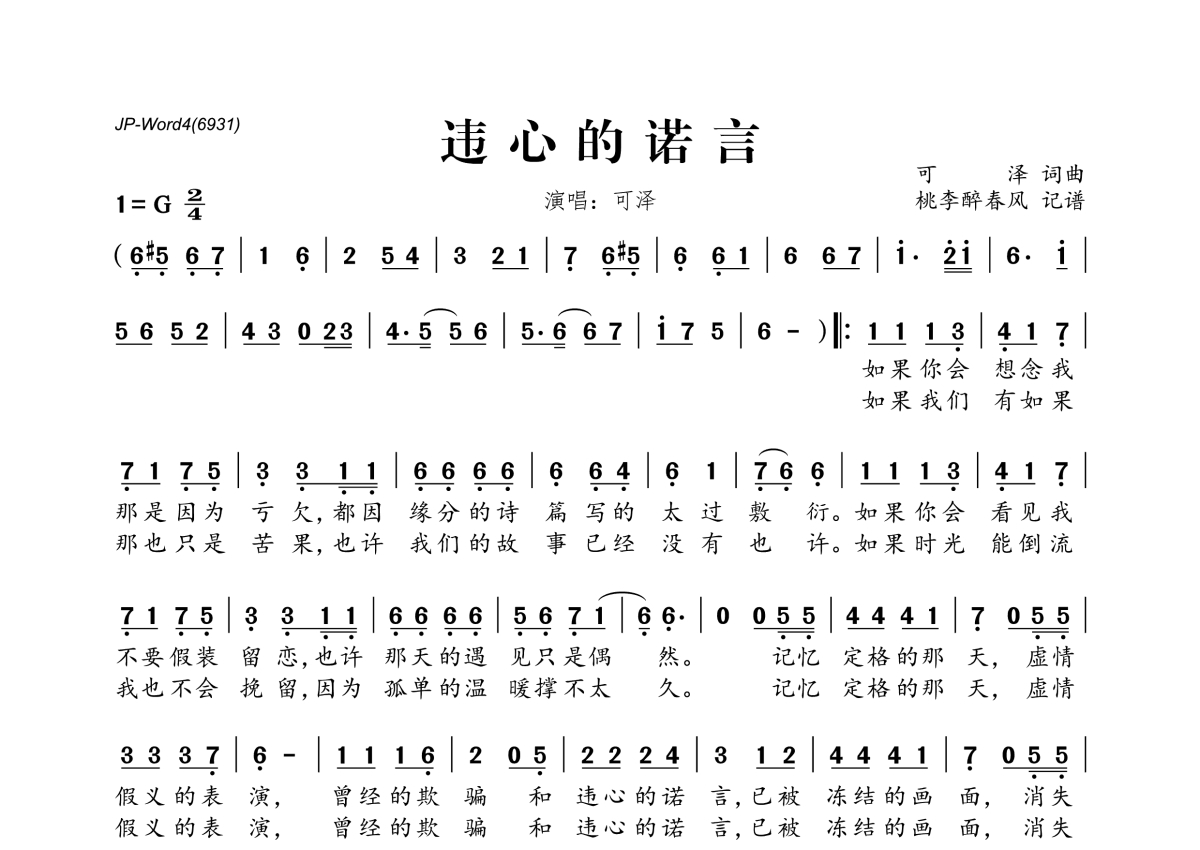 可泽《违心的诺言》简谱