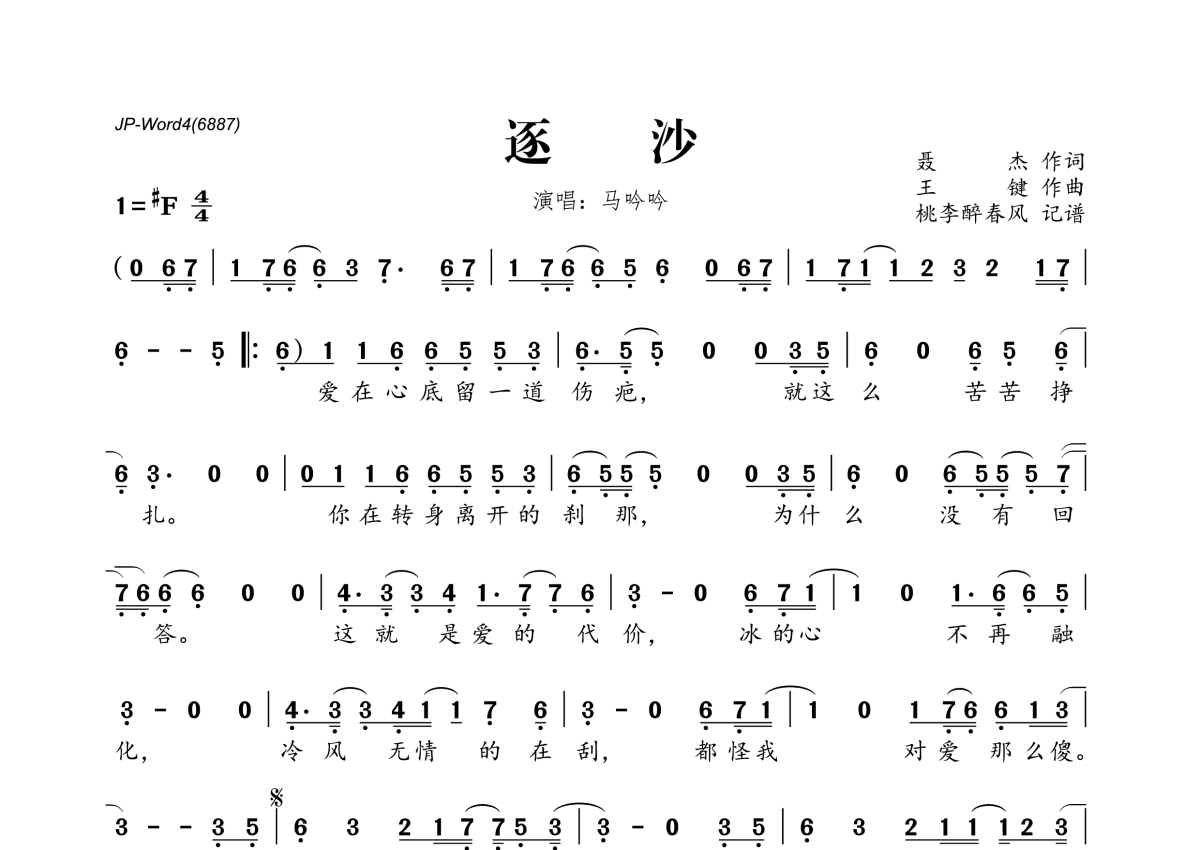 《逐沙》是马吟吟演唱的一首歌曲,拍号为4/4拍,这份简谱共有一张高清图谱,图谱由 @桃李醉春风 编配上传。