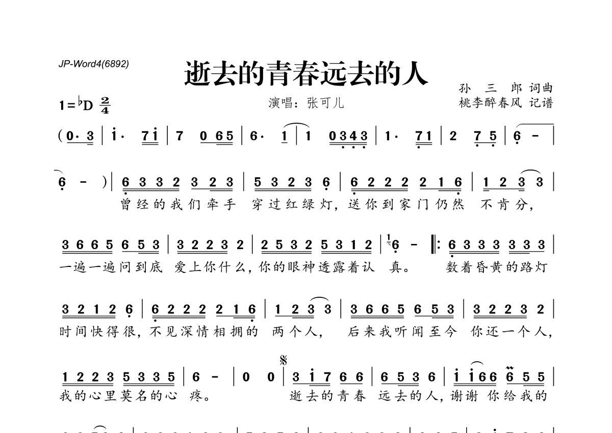 《逝去的青春远去的人》是张可儿演唱的一首歌曲,拍号为2/4拍,这份简谱共有一张高清图谱,图谱由 @桃李醉春风 编配上传。