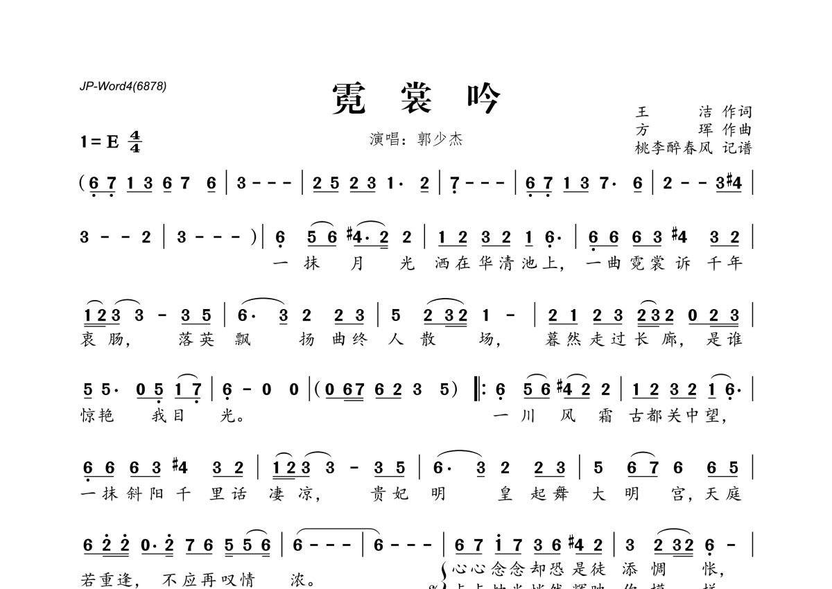 《霓裳吟》是郭少杰演唱的一首歌曲,拍号为4/4拍,这份简谱共有一张高清图谱,图谱由 @桃李醉春风 编配上传。