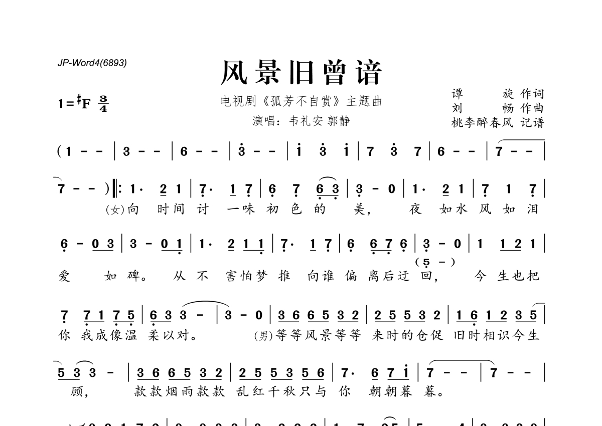 《风景旧曾谙》是韦礼安&郭静演唱的一首歌曲,拍号为3/4拍,这份简谱共有两张高清图谱,图谱由 @桃李醉春风 编配上传。