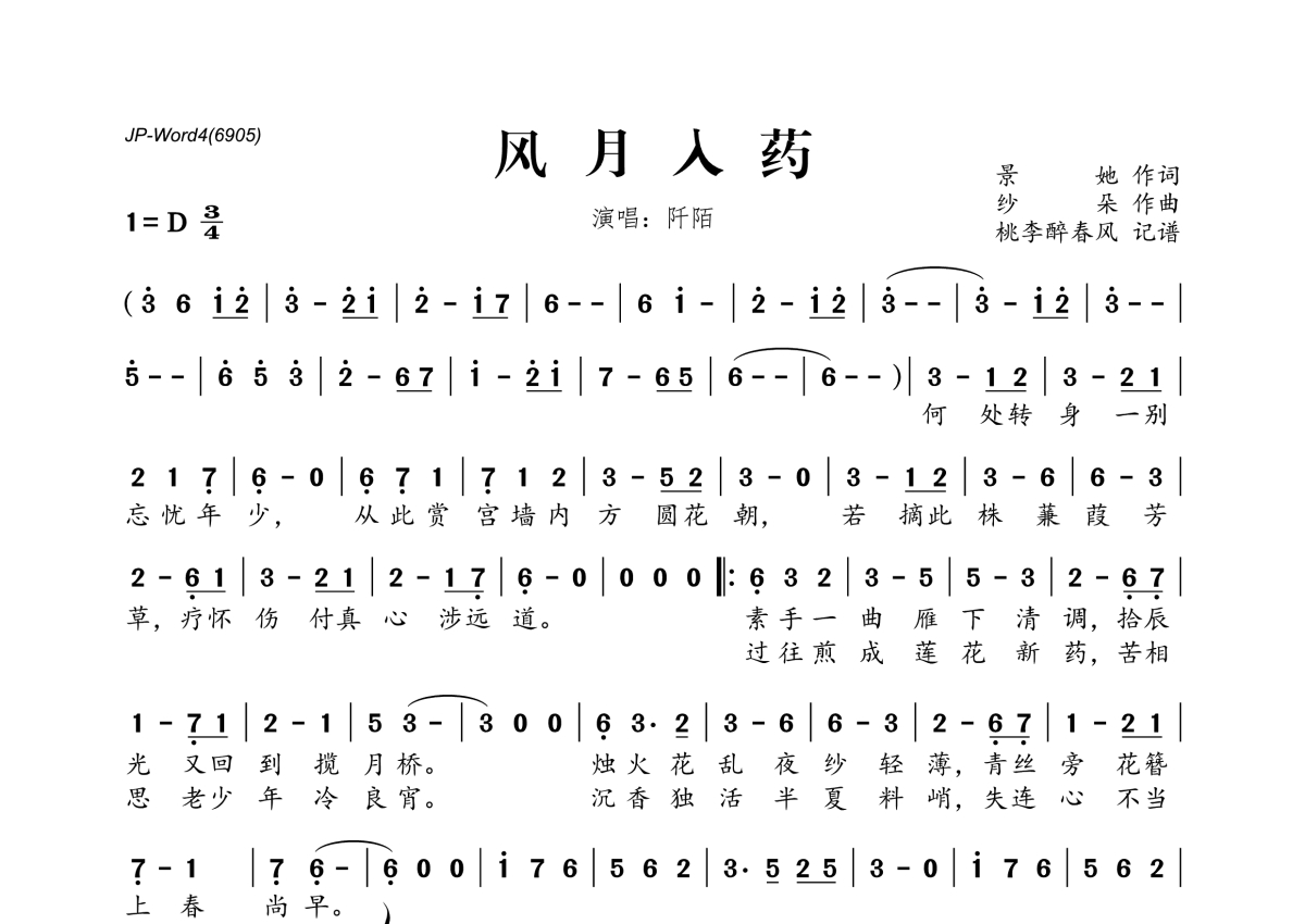 《风月入药》是阡陌演唱的一首歌曲,拍号为3/4拍,这份简谱共有一张高清图谱,图谱由 @桃李醉春风 编配上传。