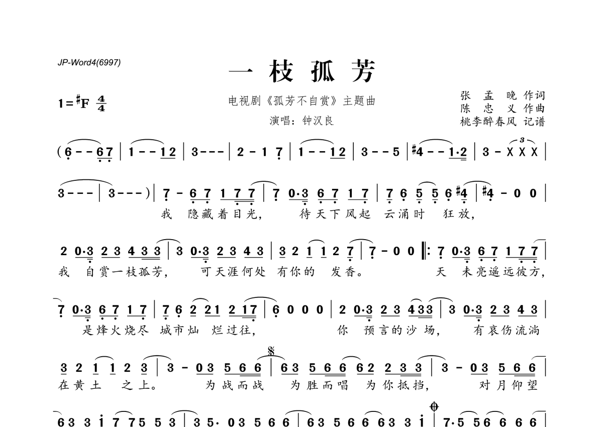 《一枝孤芳》是钟汉良演唱的一首歌曲,拍号为4/4拍,这份简谱共有一张高清图谱,图谱由 @桃李醉春风 编配上传。
