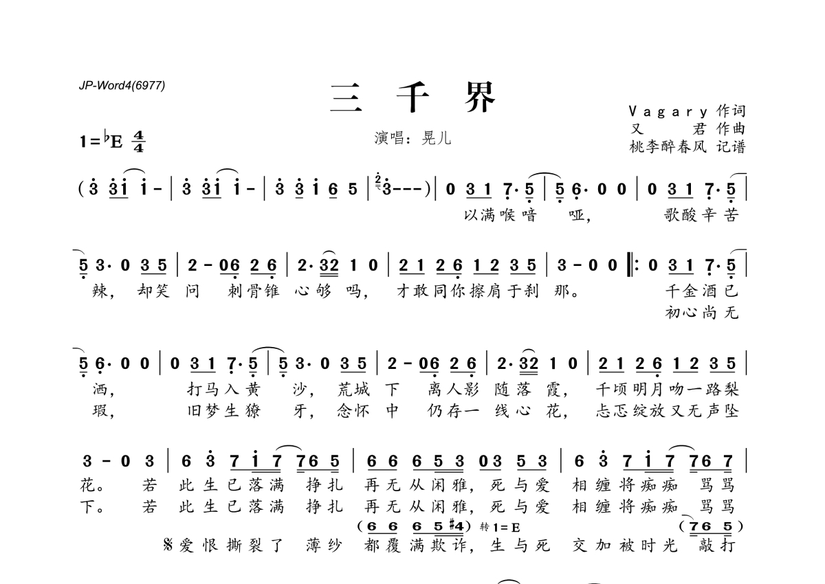 《三千界》是晃儿演唱的一首歌曲,拍号为4/4拍,这份简谱共有一张高清图谱,图谱由 @桃李醉春风 编配上传。
