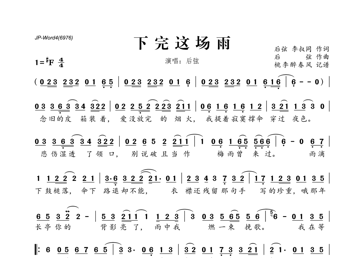 《下完这场雨》是后弦演唱的一首歌曲,拍号为4/4拍,这份简谱共有两张高清图谱,图谱由 @桃李醉春风 编配上传。