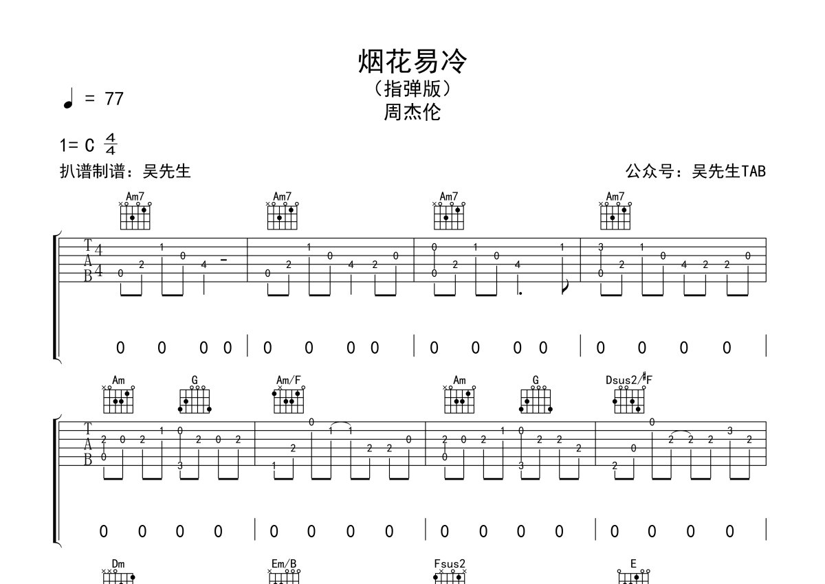周杰伦《烟花易冷》吉他谱 - C调独奏六线谱