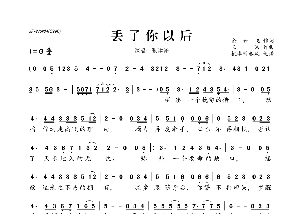 《丢了你以后》是张津涤演唱的一首歌曲,拍号为4/4拍,这份简谱共有一张高清图谱,图谱由 @桃李醉春风 编配上传。