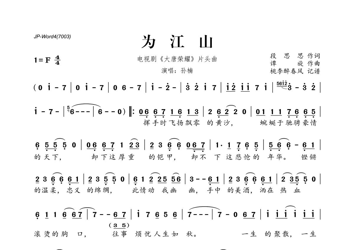 《为江山》是孙楠演唱的一首歌曲,拍号为4/4拍,这份简谱共有一张高清图谱,图谱由 @桃李醉春风 编配上传。