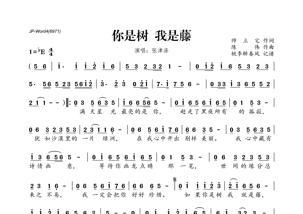 《你是树 我是藤》是张津涤演唱的一首歌曲,拍号为4/4拍,这份简谱共有一张高清图谱,图谱由 @桃李醉春风 编配上传。