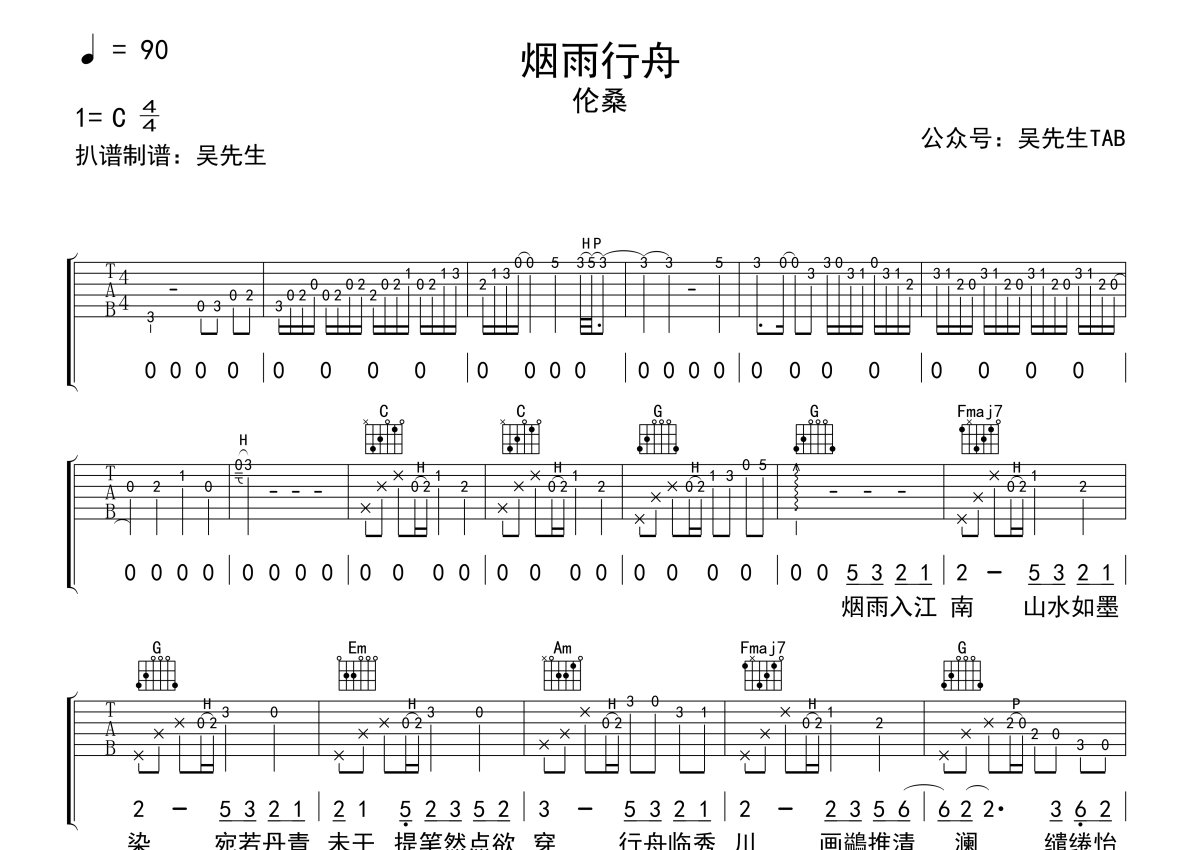 伦桑《烟雨行舟》吉他谱 - C调弹唱六线谱