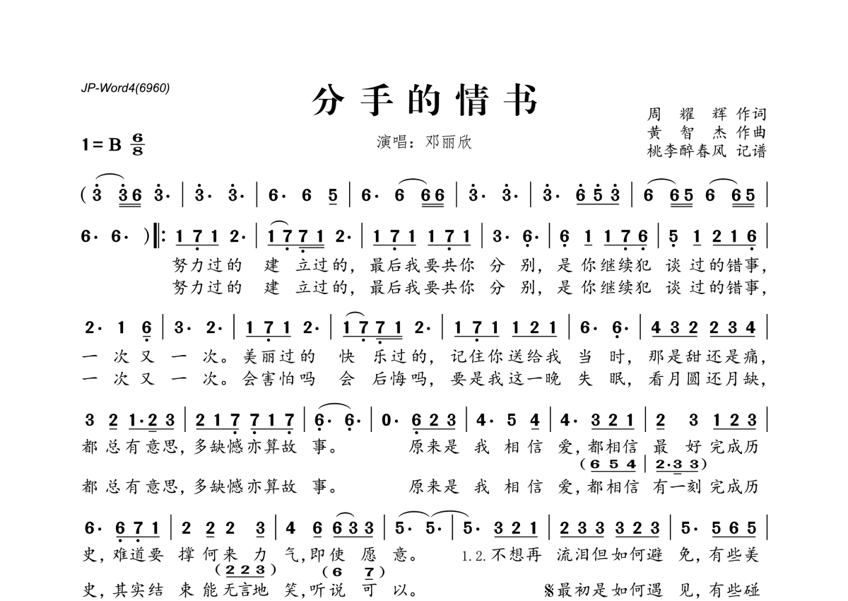 《分手的情书》是邓丽欣演唱的一首歌曲,拍号为6/8拍,这份简谱共有一张高清图谱,图谱由 @桃李醉春风 编配上传。