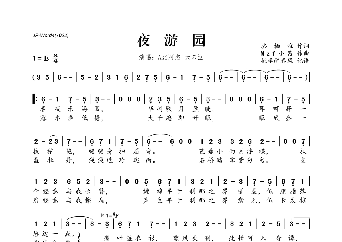 云之泣&Aki阿杰《夜游园》简谱