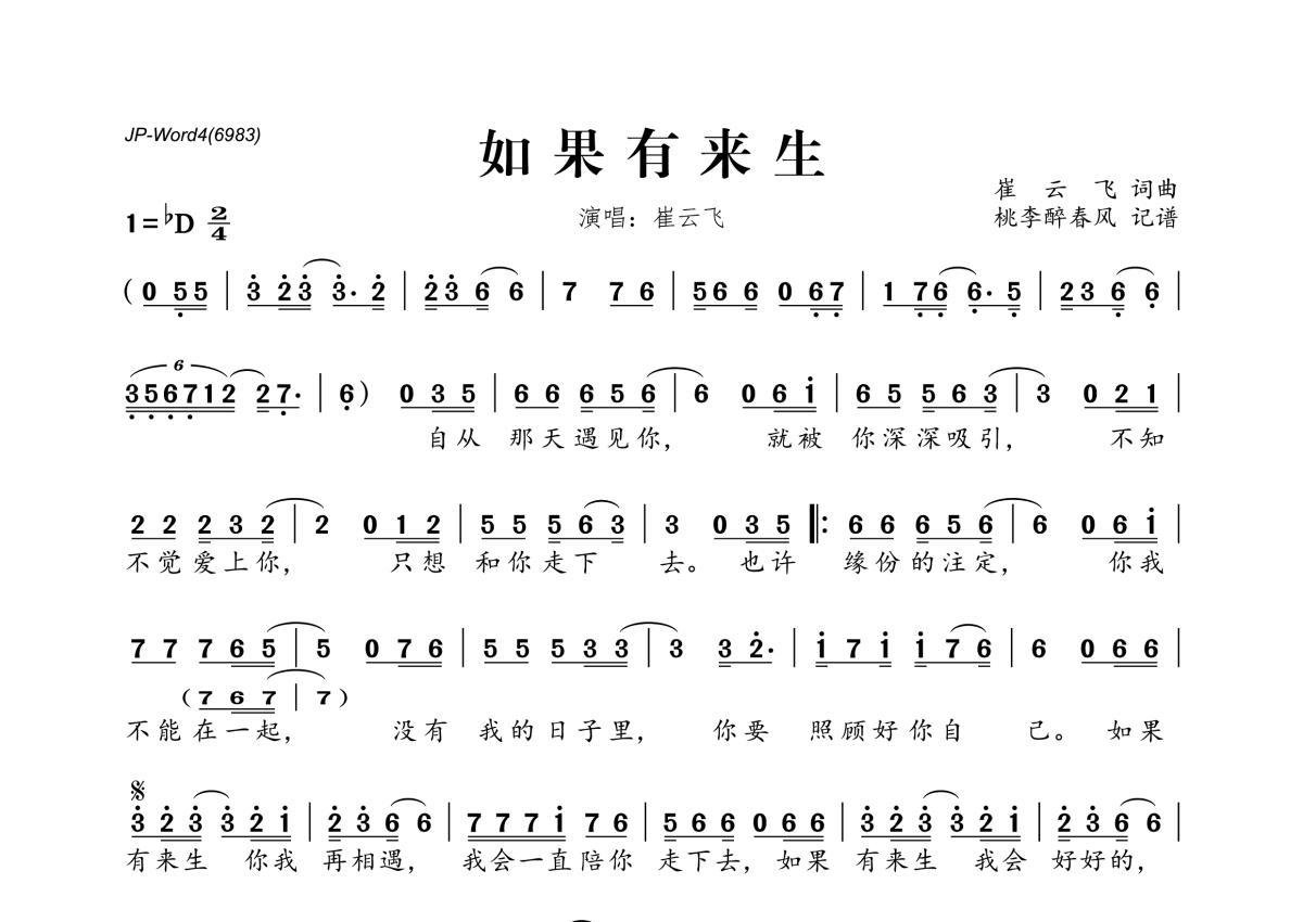《如果有来生》是崔云飞演唱的一首歌曲,拍号为2/4拍,这份简谱共有一张高清图谱,图谱由 @桃李醉春风 编配上传。
