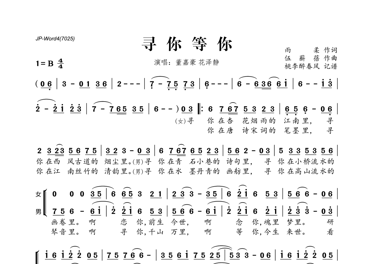 《寻你等你》是董嘉豪&花泽静演唱的一首歌曲,拍号为4/4拍,这份简谱共有一张高清图谱,图谱由 @桃李醉春风 编配上传。