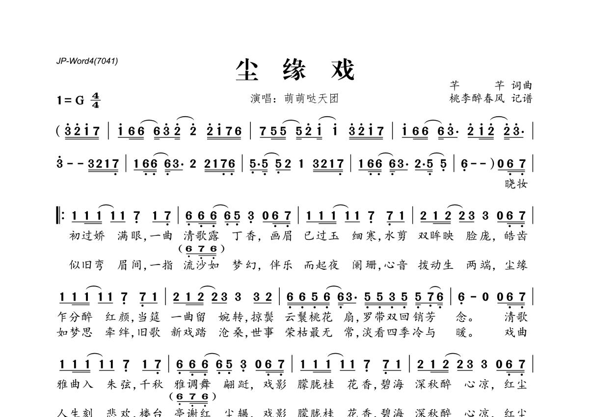 《尘缘戏》是萌萌哒天团演唱的一首歌曲,拍号为4/4拍,这份简谱共有一张高清图谱,图谱由 @桃李醉春风 编配上传。