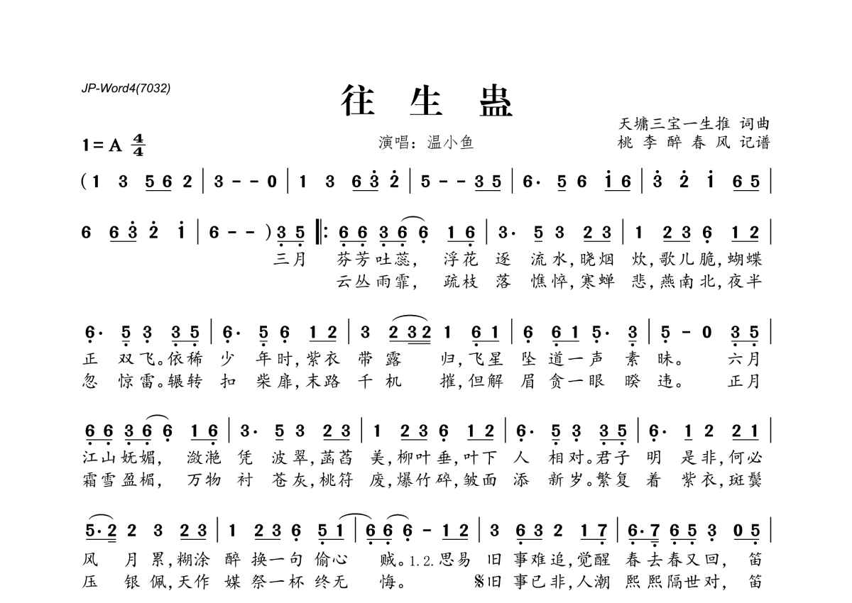 《往生蛊》是温小鱼演唱的一首歌曲,拍号为4/4拍,这份简谱共有一张高清图谱,图谱由 @桃李醉春风 编配上传。