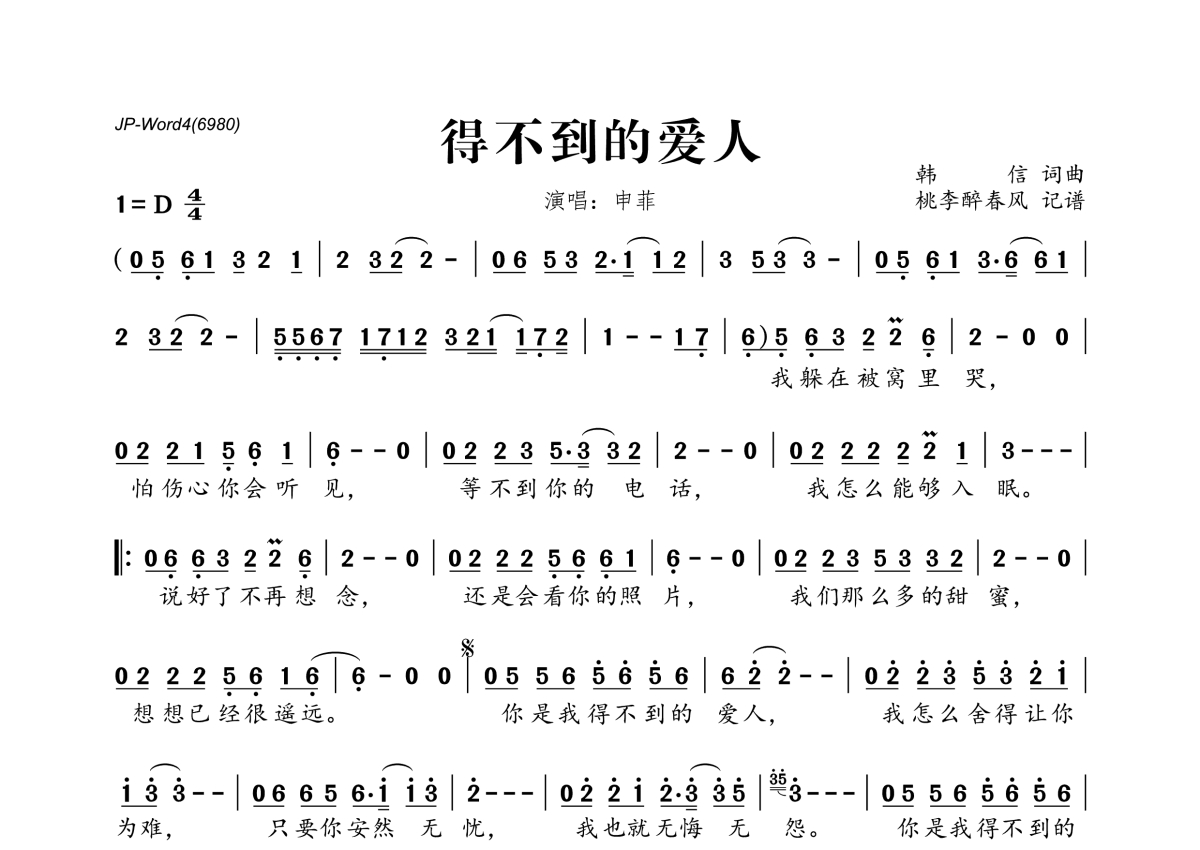 《得不到的爱人》是申菲演唱的一首歌曲,拍号为4/4拍,这份简谱共有一张高清图谱,图谱由 @桃李醉春风 编配上传。