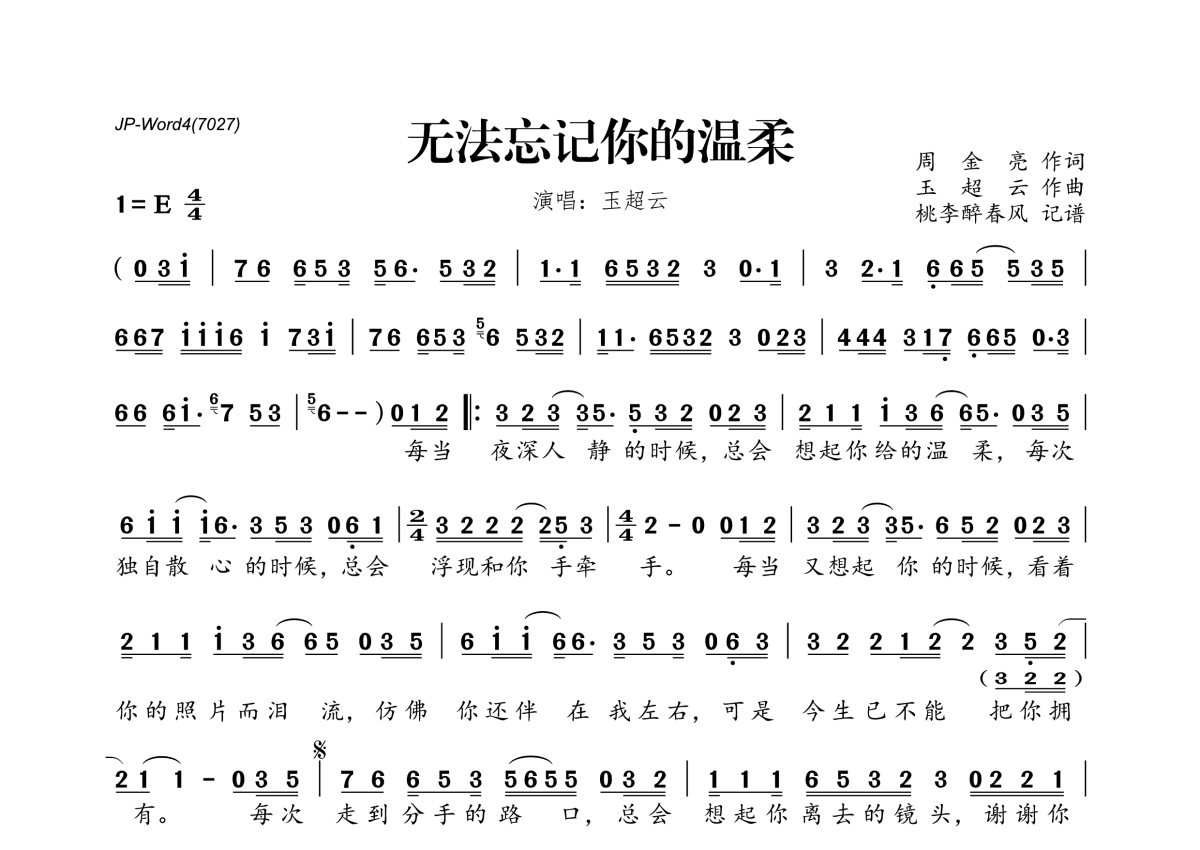 《无法忘记你的温柔》是王超云演唱的一首歌曲,拍号为4/4拍,这份简谱共有一张高清图谱,图谱由 @桃李醉春风 编配上传。