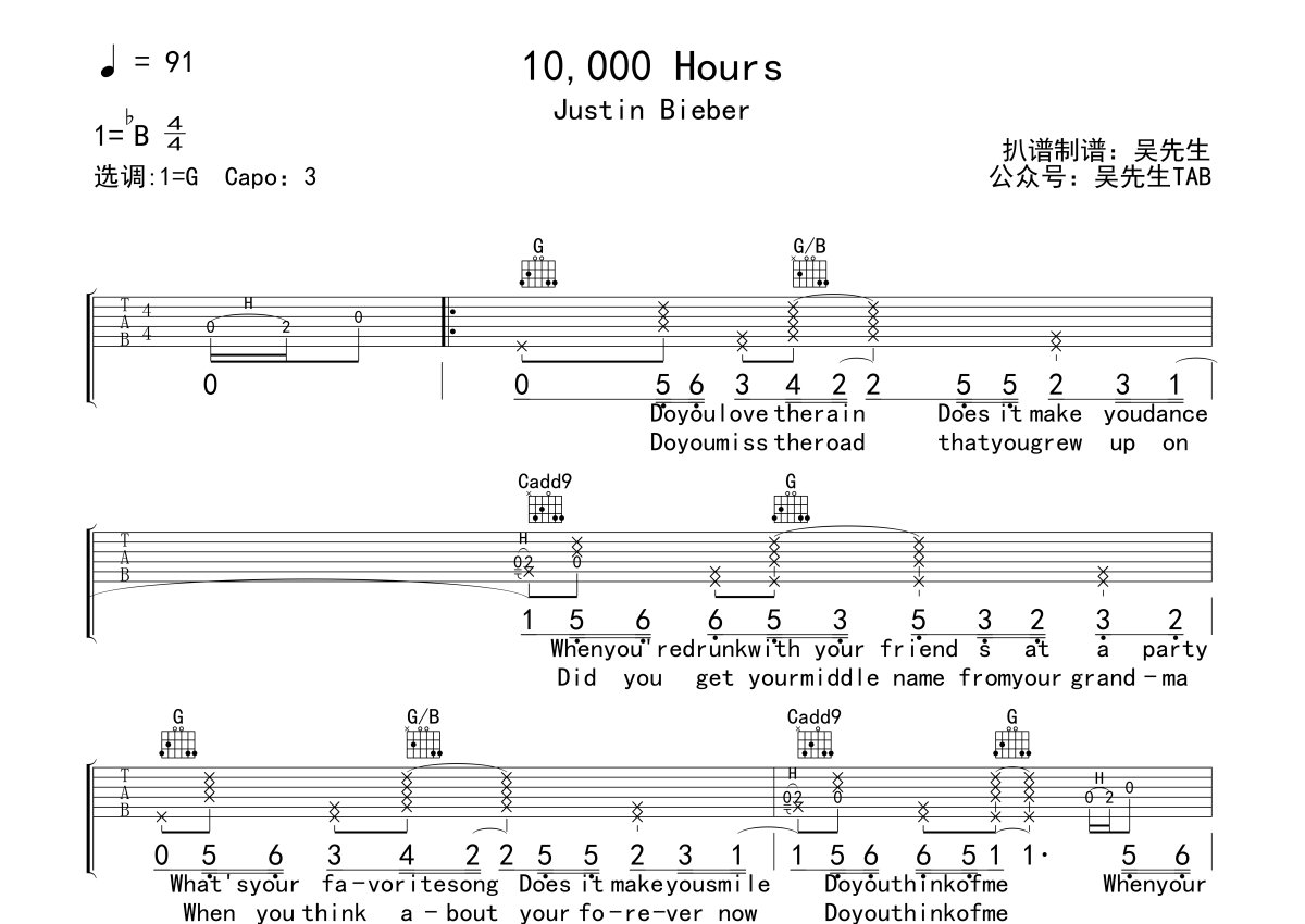 《10000 Hours》是Justin Bieber演唱的一首歌曲,本吉他谱采用的是G调指法编配,这份吉他谱共有两张高清图谱,图谱由 @吴先生TAB 编配上传,图谱使用六线谱编配,包含吉他和弦指法、简谱以及歌词部分,使用这份10000 Hours吉他谱,可以让你更加方便地掌握这首歌曲的弹唱技巧,快来尝试吧。10000 Hours吉他谱,这首歌曲是Justin Bieber(比伯)婚后的第一首单曲,据说这首歌是比伯写给他的妻子Hailey Baldwin(海莉)的。10000 Hours六线谱,选用G调指法,变调夹夹三品,。