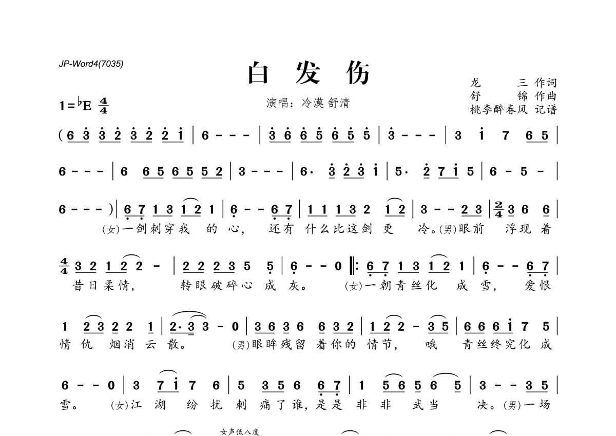 《白发伤》是冷漠&舒清演唱的一首歌曲,拍号为4/4拍,这份简谱共有一张高清图谱,图谱由 @桃李醉春风 编配上传。