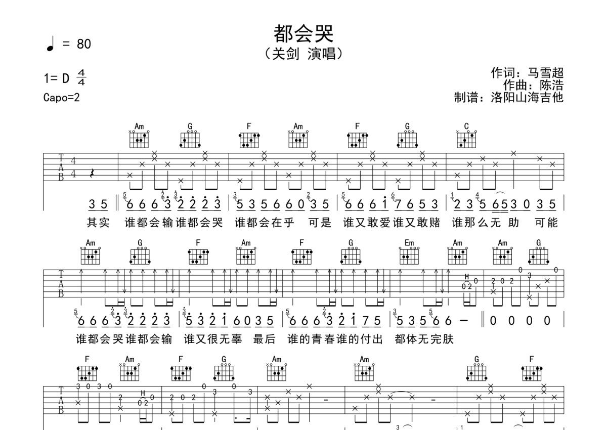 关剑《都会哭》吉他谱 - C调弹唱六线谱