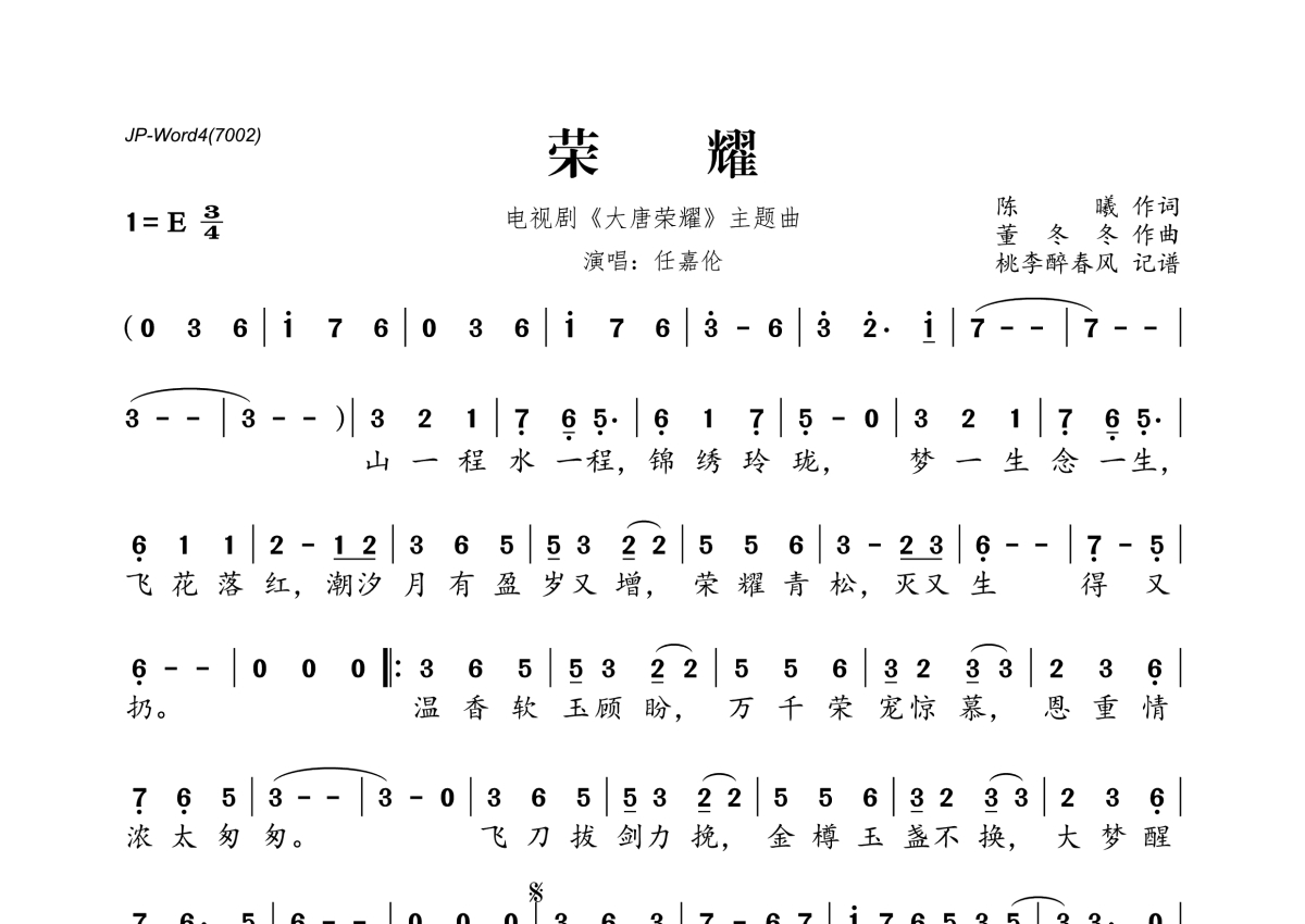 《荣耀》是任嘉伦演唱的一首歌曲,拍号为3/4拍,这份简谱共有一张高清图谱,图谱由 @桃李醉春风 编配上传。