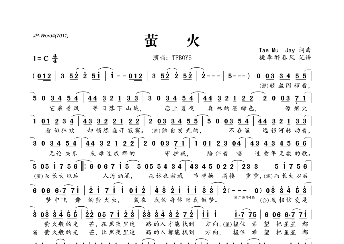 《萤火》是TFBOYS演唱的一首歌曲,拍号为4/4拍,这份简谱共有一张高清图谱,图谱由 @桃李醉春风 编配上传。